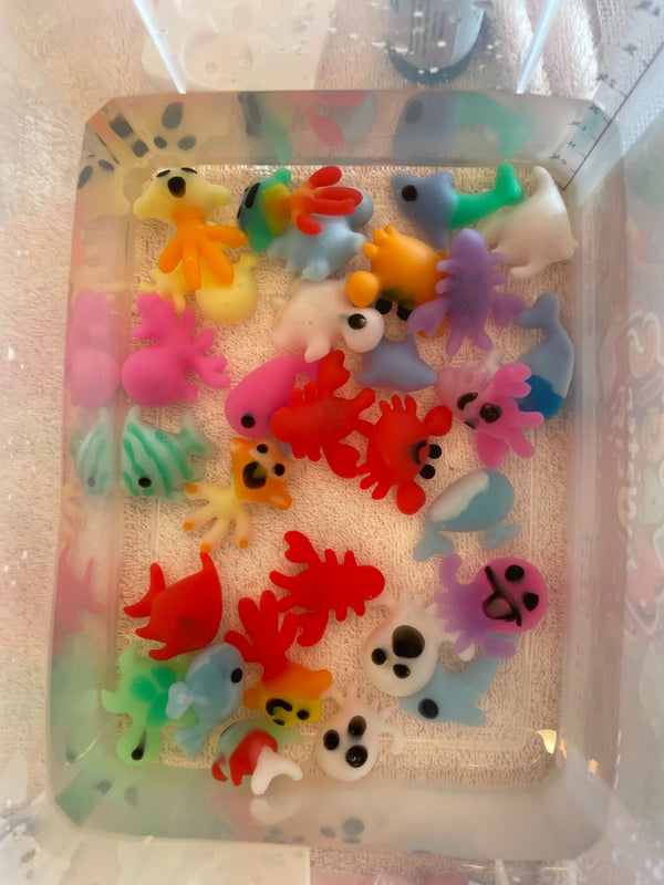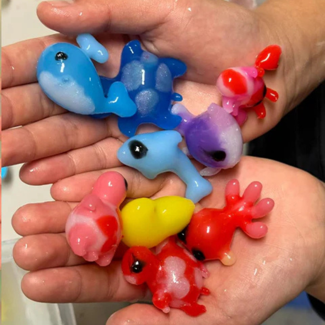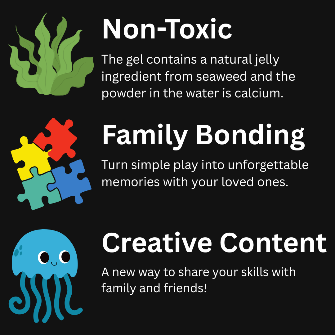 When you squeeze the colored gel into a mold and dip it into the magic water solution the gel instantly turns into a real jelly creature you can hold. You can play with them indoors or outside.